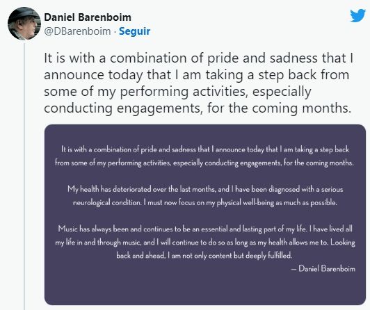 "Es con una combinación de orgullo y tristeza que anuncio hoy que daré un paso atrás en algunas de mis actividades escénicas, especialmente en los compromisos de dirección orquestal, durante los próximos meses", comenzó expresando.