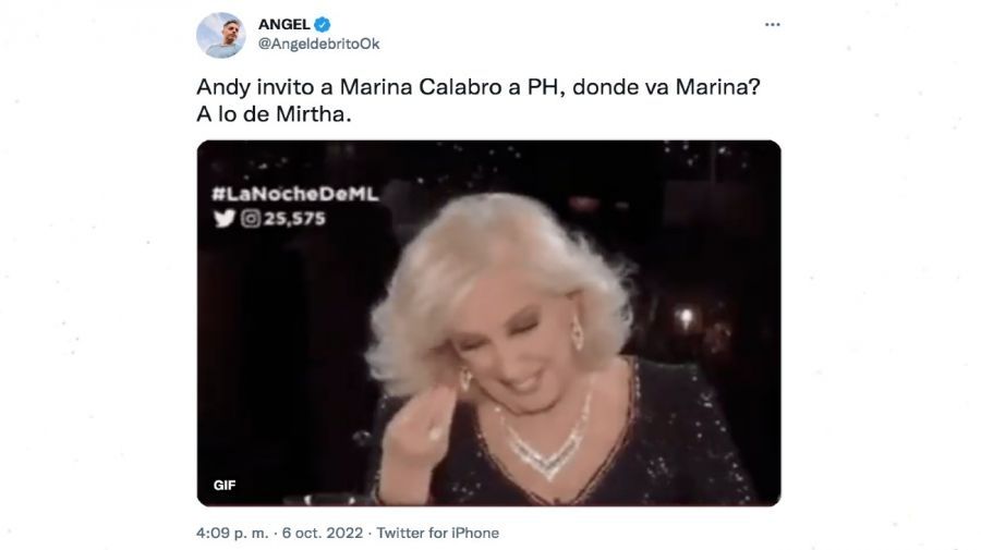 "Andy invito a Marina Calabro a 'PH', ¿dónde va Marina? A lo de Mirtha", detalló De Brito. Además, trascendió que la periodista se comunicó personalmente con la legendaria conductora para pedirle disculpas por un comentario en el que había asegurado que la abuela de Juana Viale quiso comprar un Martín Fierro, y otro en el que sugirió que la presencia de La Chiqui en las butacas de una función teatral fue arreglada con un "estipendio" de por medio. Además de Calabró, estarán como invitados en La noche de Mirtha (El Trece) Eduardo Feinmann, L-Gante, Luciana Salazar y Roberto García Moritán.