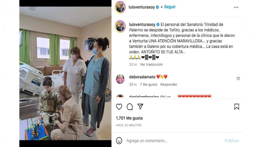 "El personal del Sanatorio Trinidad de Palermo se despide de Toñito, gracias a los médicos, enfermeros, infectólogos y personal de la clínica que le dieron a Venturita UNA ATENCIÓN MARAVILLOSA... La casa está en orden. ANTOÑITO SE FUE DE ALTA", expresó con felicidad Luis Ventura.