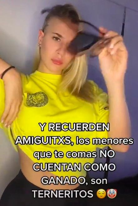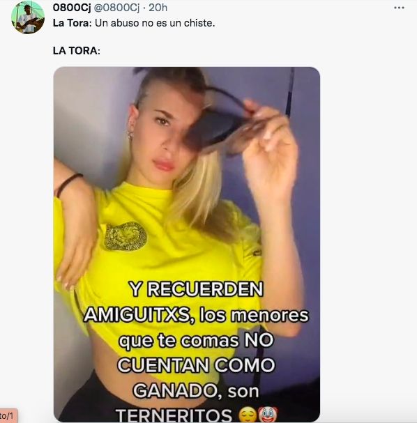 En el posteo, La Tora mirá fijo a la cámara y se pone unos anteojos de sol. En la imagen se lee: "Y recuerden amigos, los menores que te comas no cuentan como ganado, son terneritos".