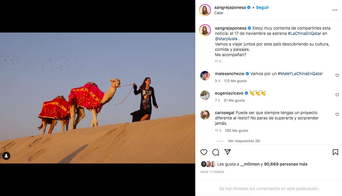 Sin embargo, sus fans se preguntaron qué hace la actriz allí. Fue la propia Eugenia quien le puso fin al misterio: "Estoy muy contenta de compartirles esta noticia: el 17 de noviembre se estrena #LaChinaEnQatar en Star Plus. Vamos a viajar juntos por este país descubriendo su cultura, comida y paisajes. ¿Me acompañan?", expresó La China en lo que será su primera experiencia como conductora.