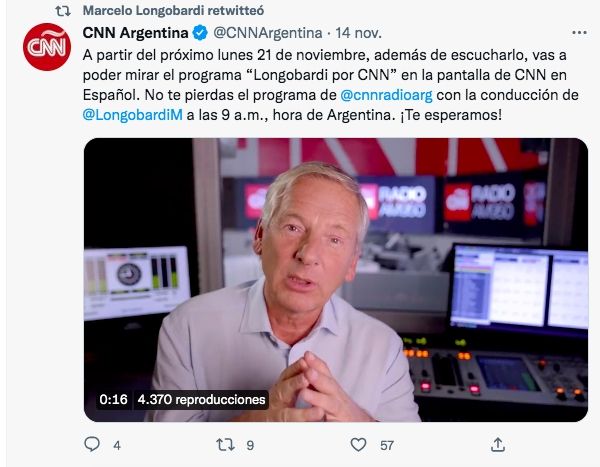 Marcelo Longobardi vuelve a la televisión, al menos por una hora. Desde CNN confirmaron que la última parte del programa de radio Longobardi por CNN será transmitido por la señal televisiva de la cadena de noticias estadounidense desde el lunes para toda la región.