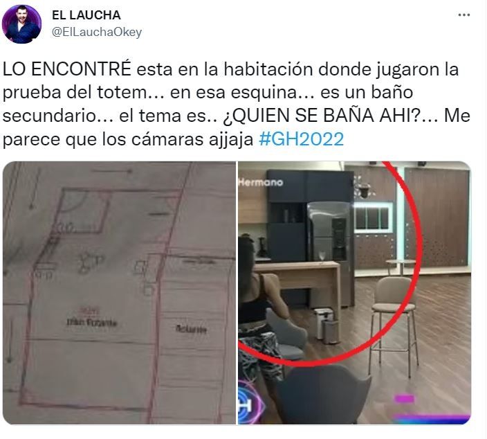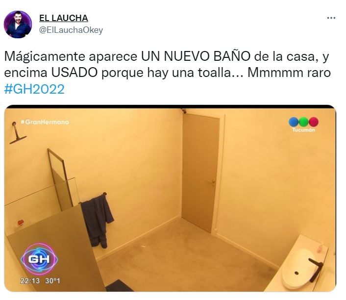 Quien hizo notar el espacio de la casa que nunca antes se había visto fue el youtuber El Laucha.“Mágicamente aparece un nuevo baño en la casa y encima usado, porque hay una toalla… Mmmm raro”, escribió, junto a la imagen del rincón misterioso, distinto al único baño habilitado a los participantes.