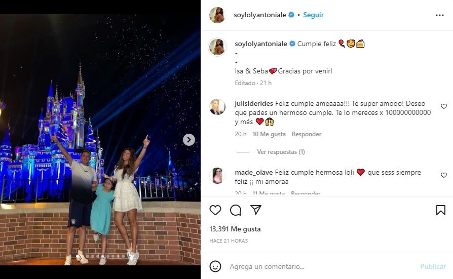 Loly cumplió 35 años este viernes 18 de noviembre, y es por eso que decidió mostrarles a sus seguidores varias imágenes celebrando en los parques temáticos de Disney, en Orlando. “Cumple feliz. Isa & Seba. Gracias por venir!”, escribió junto a varios emojis como pie de las fotos.