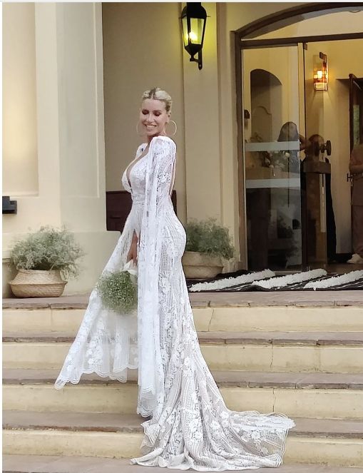 El casamiento se vibra en la localidad de Tolombón, ubicada a unos once kilómetros de Cafayate, ese centro tan famoso por sus viñedos. A raíz del entorno natural, la vestimenta se entrelazó con esa ambientación, por eso la creadora del atuendo de Flor, Camila Romano, contó, en diálogo con Teleswhow: “Lo diseñé pensando en el entorno que es al atardecer en un viñedo y conociendo a flor y su cuerpo que le gusta estar super sexy, líneas al cuerpo, cola y terminaciones bordadas a mano”.
