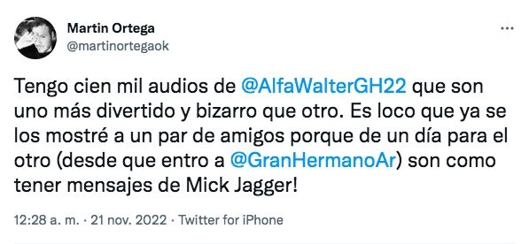 "Tengo cien mil audios de Alfa que son uno más divertido que otro", publicó el productor Martín Ortega en su cuenta de Twitter, y la producción de LAM, los consiguió.