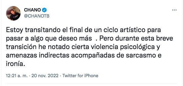 "Estoy transitando el final de un ciclo artístico para pasar a algo que deseo más. Pero durante está breve transición he notado cierta violencia psicológica y amenazas indirectas acompañadas de sarcasmo e ironía", comenzó expresando el ex Tan Biónica.