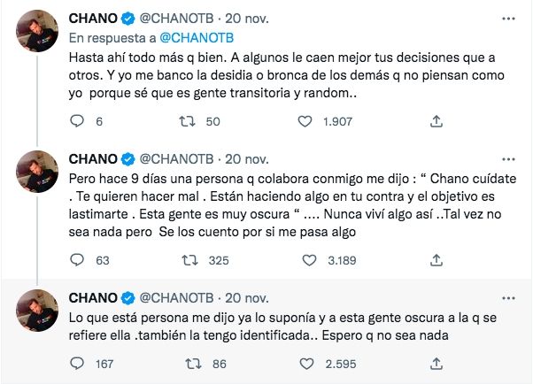 "Hace 9 días una persona que colabora conmigo me dijo: ‘Chano cuídate. Te quieren hacer mal. Están haciendo algo en tu contra y el objetivo es lastimarte. Esta gente es muy oscura’. Nunca viví algo así... Tal vez no sea nada, pero se los cuento por si me pasa algo", disparó despertando las alarmas de todos.