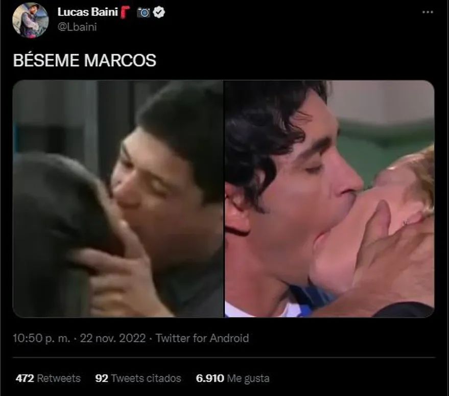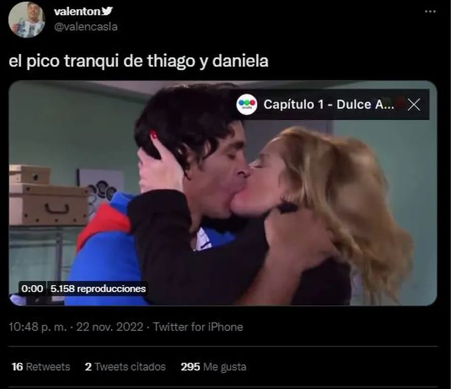 Entonces Del Moro propuso: “Si gana Thiago la prueba, se viene el beso”. Tras la aceptación de la pareja, Thiago y Daniela sorprendieron con un apasionado beso que desató memes evocando las legendarias escenas entre los personajes de Marcos y Victoria, roles que interpretaron Sebastián Estevanez y Carina Zampini en la novela Dulce Amor.
