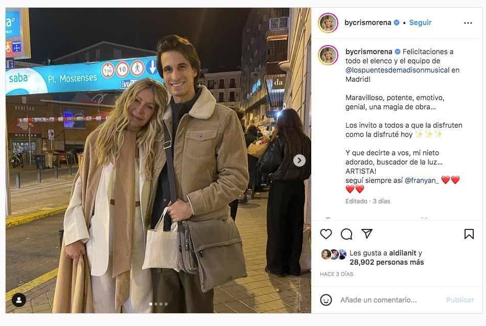 Entonces, Morena se fotografió con su nieto y escribió: “Felicitaciones a todo el elenco y el equipo de @lospuentesdemadisonmusical en Madrid. Maravilloso, potente, emotivo, genial, una magia de obra. Los invito a todos a que la disfruten como la disfruté hoy”.