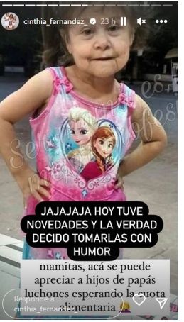 En pos de hablar del tema y aplicarle una pizca de humor, Cinthia acudió a photoshopear una foto de una de sus tres hijas y dejarle un efecto como del paso de los años, para que luzca prácticmente como una abuela. Un mensaje de la dilación que padece de Defederico.