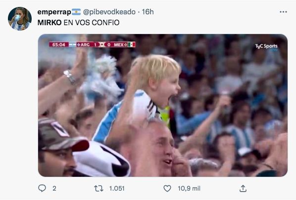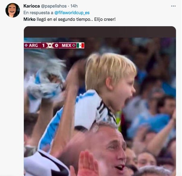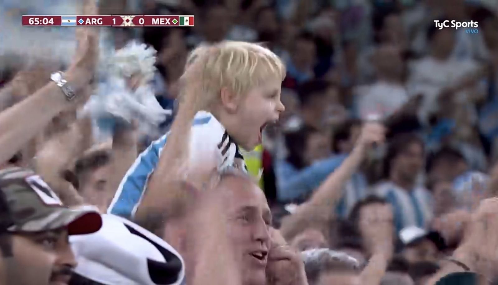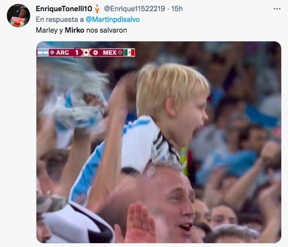 El triunfo de Argentina frente a México en el Mundial de Qatar se convirtió en motivo de celebración. Entre ellos, hubo muchos famosos que se dieron cita en el estadio para ver la actuación del seleccionado argentino. Y la sorpresa fue total cuando la cámara de la transmisión oficial de la FIFA enfocó a Mirko sobre los hombros de su papá Marley gritando desaforado el gol de Messi. Rápidamente, la foto se hizo viral.