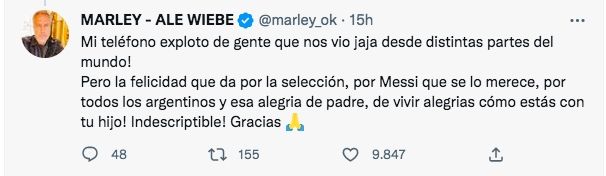 Tras las repercusiones de las imágenes, el conductor se expresó a través de su cuenta de Twitter: "Mi teléfono explotó de gente que nos vio desde distintas partes del mundo! Pero la felicidad que da por la selección, por Messi que se lo merece, por todos los argentinos y esa alegría de padre, de vivir alegrías cómo estás con tu hijo! ¡Indescriptible! Gracias".