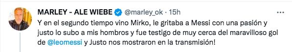 "Y en el segundo tiempo vino Mirko, le gritaba a Messi con una pasión y justo lo subo a mis hombros y fue testigo de muy cerca del maravilloso gol de @leomessi y justo nos mostraron en la transmisión", agregó.