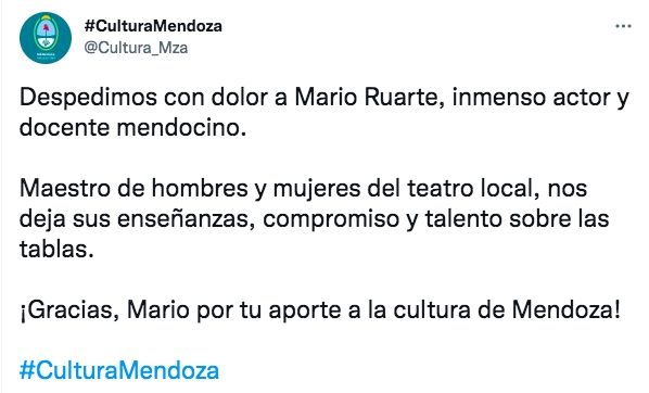 "Maestro de hombres y mujeres del teatro local, nos deja sus enseñanzas, compromiso y talento sobre las tablas", agregaron "¡Gracias, Mario por tu aporte a la cultura de Mendoza!", finalizaron en el posteo que publicaron en homenaje a la inmensa trayectoria y aporte de Ruarte a la cultura mendocina.