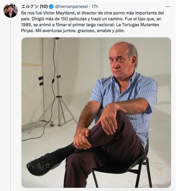 "Se nos fue Víctor Maytland, el director de cine porno más importante del país. Dirigió más de 150 películas y trazó un camino. Fue el tipo que, en 1989, se animó a filmar el primer largo nacional: La Tortugas Mutantes Pinjas. Mil aventuras juntos: gracioso, amable y pillo", expresó.