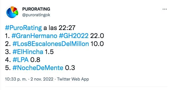 Antes de las 22.30 ya Gran Hermano tocaba el pico de 22 puntos, arrasando con la competencia, que sumados todos los canales no los alcanzaría.