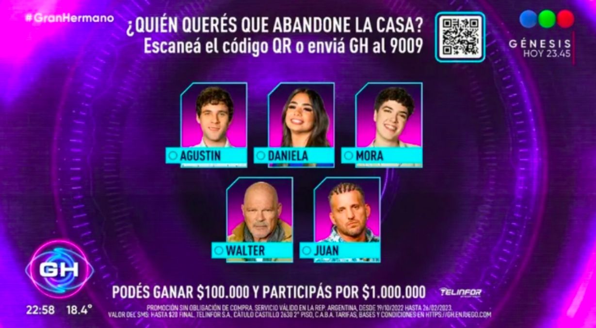 Recordemos que desde las 21.45 comenzó a conocerse a quiénes nominaron cada uno de los participantes del reality. Finalmente, la placa quedó conformada por cinco nominados: Agustín (19), Daniela (7), Mora (6), Walter (5) y Juan (5). Recordemos que este jueves, Romina salvará a uno de ellos ya que es la líder de la semana.