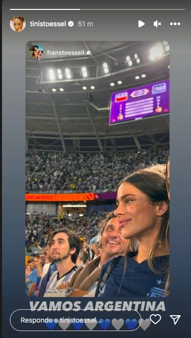 "Vamos Argentina", expresó Tini Stoessel, quien volvió a acompañar a su novio Rodrigo de Paul desde la platea del un estadio.