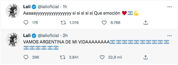 Lali Espósito fue una de las primeras que apoyó a la Selección y descargó todos sus nervios al terminar el partido: "Vamos Argentina de mi vidaaaaaaa", escribió la cantante.