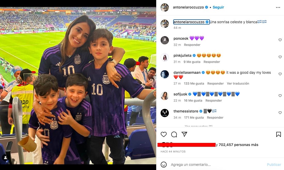 Por su parte, Antonela Roccuzzo celebró la victoria con un tiernas fotos en las redes sociales. "Una sonrisa celeste y blanca", redactó la pareja del futbolista del París Saint Germain junto a sus hijos.