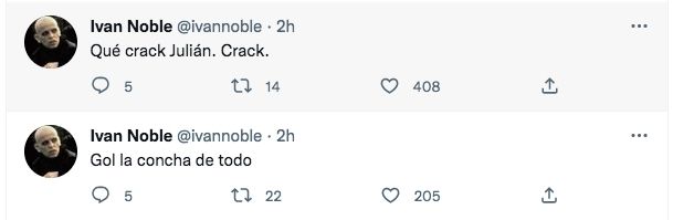 Por su parte, Iván Noble no se quedó atrás al revelar su emoción por el primer gol del seleccionado. "Gol la concha de todo", compartió el cantante en sus redes sociales. Luego agregó un gesto por el gol de Julián Álvarez. "Crack".
