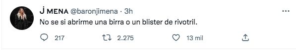 En la previa del partido, Jimena Barón expresó en su cuenta de Twitter: "No se si abrirme una birra o un blister de rivotril".