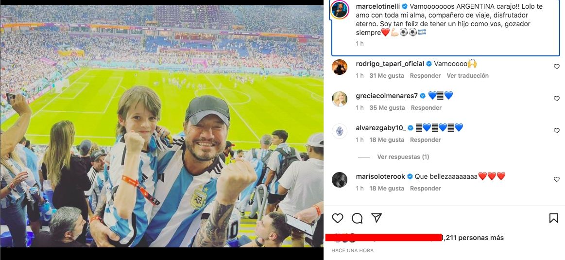 Desde del 974 stadium, Marcelo Tinelli festejó el triunfo de Argentina en compañía de su hijo Lolo. "Vamooooooos ARGENTINA carajo!! Lolo te amo con toda mi alma, compañero de viaje, disfrutador eterno. Soy tan feliz de tener un hijo como vos, gozador siempre".