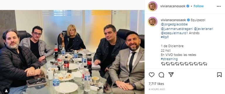 Para dar a conocer este nuevo encuentro por streaming, Viviana Canosa compartió una foto junto a los panelistas que la acompañarán en la ocasión: Jorge Giacobbe, Javier Lanari, Juan Manuel Dragani y Ezequiel Spillman.