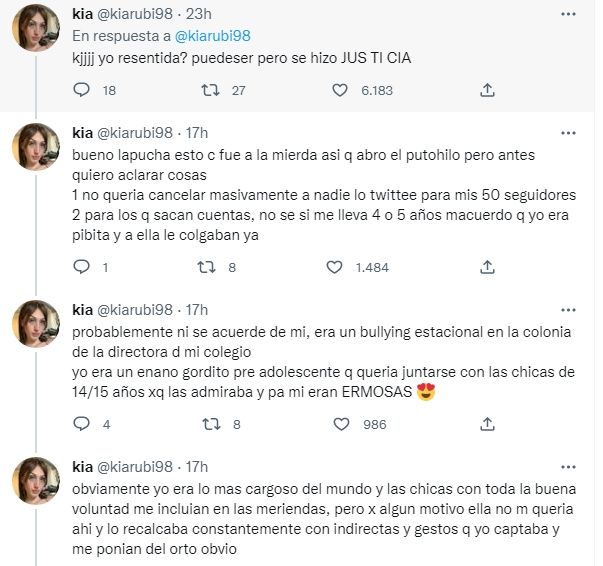 "Probablemente ni se acuerde de mi, era un bullying estacional en la colonia de la directora d mi colegio yo era un enano gordito pre adolescente q queria juntarse con las chicas de 14/15 años xq las admiraba y pa mi eran ERMOSAS", continúa el descargo de Kia.