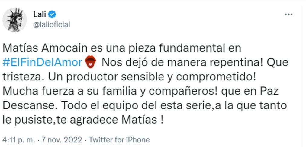 A los pocos días del estreno de El fin del amor, murió uno de sus productores, el chileno Matías Amocain, y Lali Espósito fue una de las primeras en expresar sus condolencias en las redes sociales.