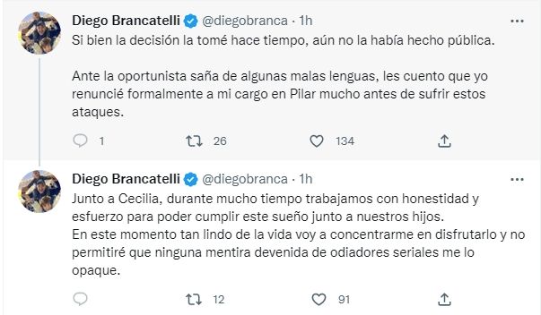 "Si bien la decisión la tomé hace tiempo, aún no la había hecho pública", comenzó expresando en su cuenta oficial de Twitter. "Ante la oportunista saña de algunas malas lenguas, les cuento que yo renuncié formalmente a mi cargo en Pilar mucho antes de sufrir estos ataques", agregó Brancatelli.
