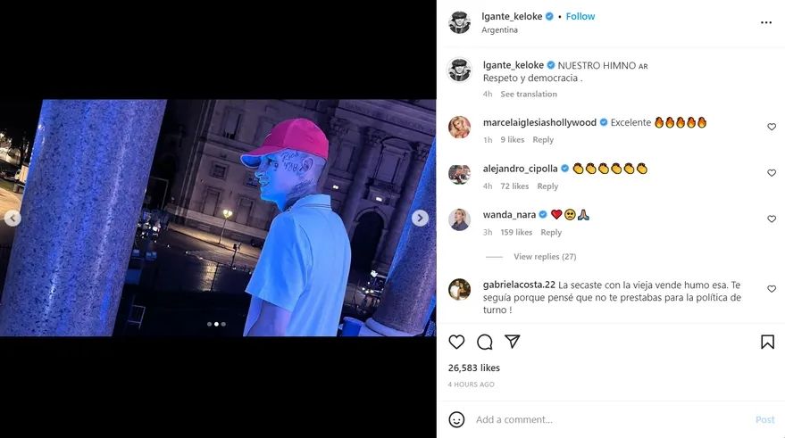 Si bien los posteos contaron con el apoyo de algunos famosos y de seguidores de L-Gante que expresaron comentarios como: "A la gilada ni cabida", "Qué crack", "Esto es argentina", "Piel de gallina". También hubo detractores que con tajantes mensajes manifestaron: "Asco", "Cara rota", "Para atrás el país permitiendo que canten el himno como quieren vamos sigamos así che", "Cuando creés que no se puede caer más bajo...".