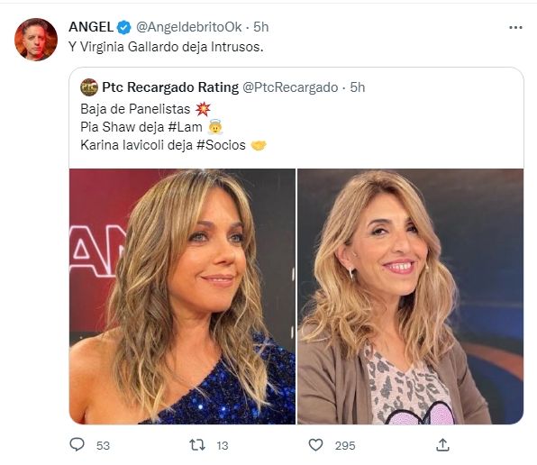 Fue Ángel de Brito quien reveló la información desde su cuenta de Twitter. Primero, Pia Shaw sorprendió al revelar que deja LAM (América TV), mientras que Karina Iavícoli regresa a Intrusos (América TV) y abandona Socios del espectáculo (El Trece) por cuestiones familiares.