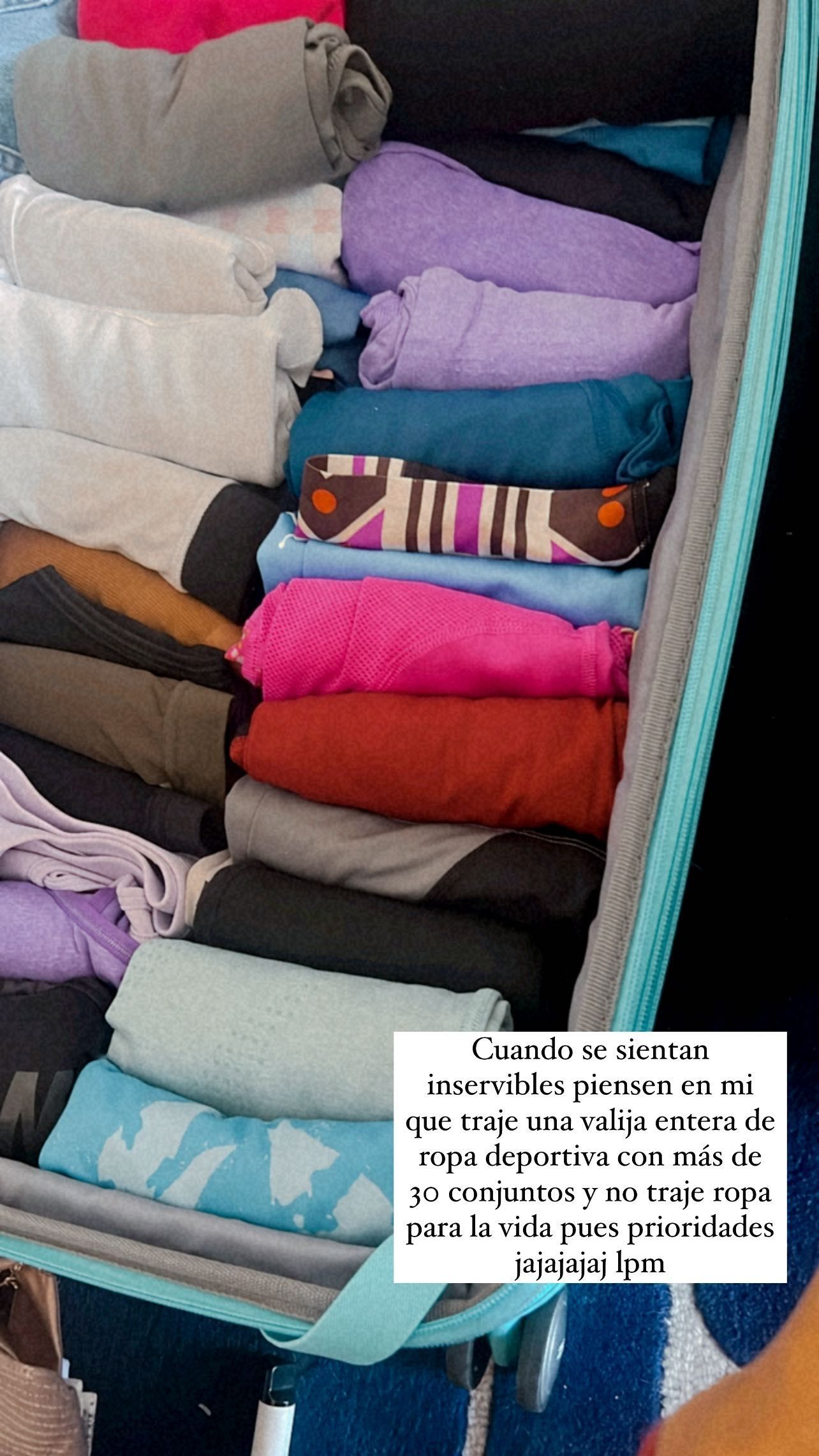 Desde sus historias de Instagram, Gandolfo reconoció que el armado de su valija no fue del todo afortunado y lo compartió con una elocuente foto en la que se pueden apreciar pilas de conjuntos deportivos.