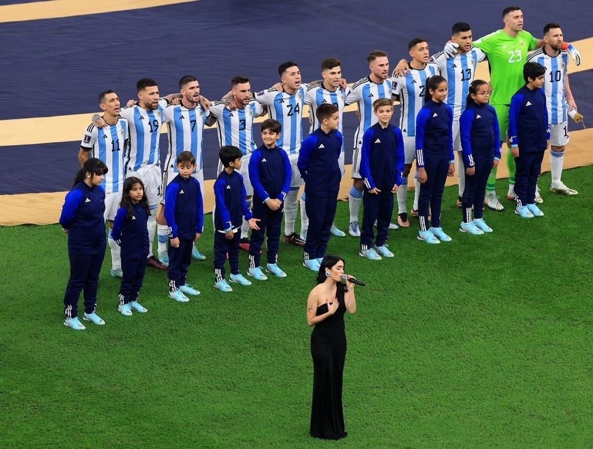 Fue una versión diferente a la de otros partidos, ya que más allá de la parte instrumental a la que estamos acostumbrados, en esta ocasión la artista pop más importante de Argentina y de las más reconocidas en todo el mundo, que se encuentra desde hace días en Qatar, tomó el micrófono y entonó las estrofas del clásico himno nacional.