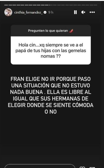 En esa fascinación por hablar en su Instagram, Cinthia activó el feedback con sus millones de seguidore y así le cayó una pregunta filosa: "¿Por qué se ve siempre al papá de tus hijas con las gemelas nomás?". Una incógnita que supuestamente le extendió un usuario.