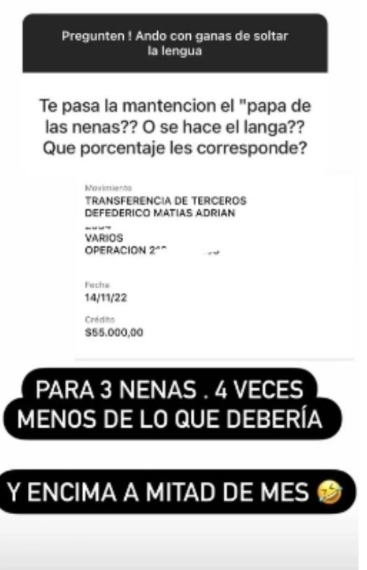 Defederico no cumple con la cuota alimentaria exigida por la Justicia por las tres nenas y la panelista de Momento D no deja pasar oportunidad para denunciarlo. En sus redes sociales, Fernández se descarga con furiosos posteos, ironías y hasta llegó a mostrar los magros comprobantes de transferencia bancaria que recibe en su cuenta.