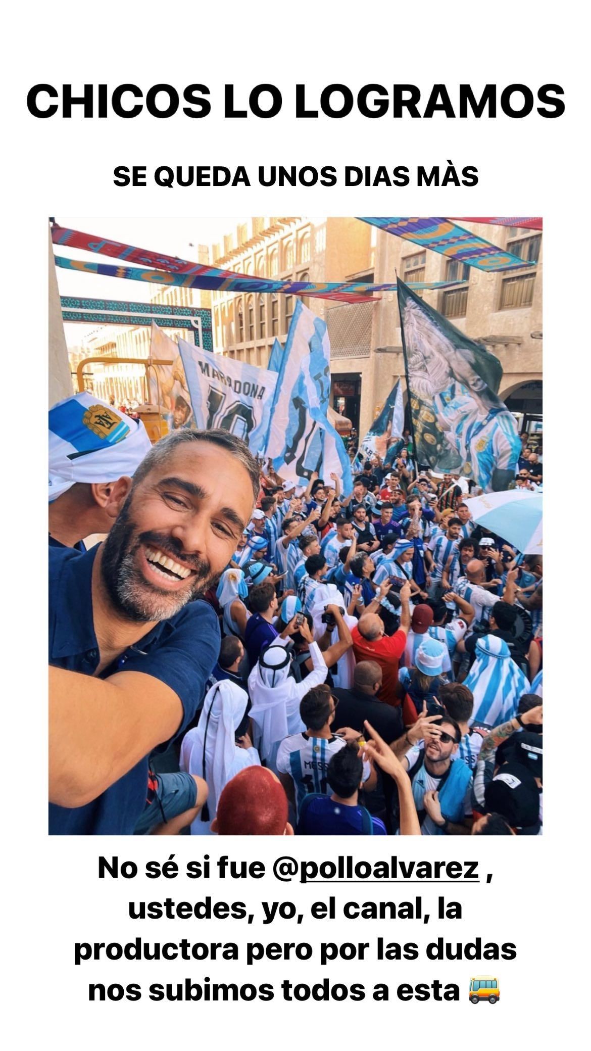 Finalmente, los ruegos de la cocinera dieron sus frutos para que el Pollo Álvarez siga en el Mundial de Qatar. "Chicos lo logramos. Se queda unos días más. No sé si fue @polloalvarez, ustedes, yo, el canal, la productora, pero por las dudas nos subimos todos a esta", escribió Tefi Russo.