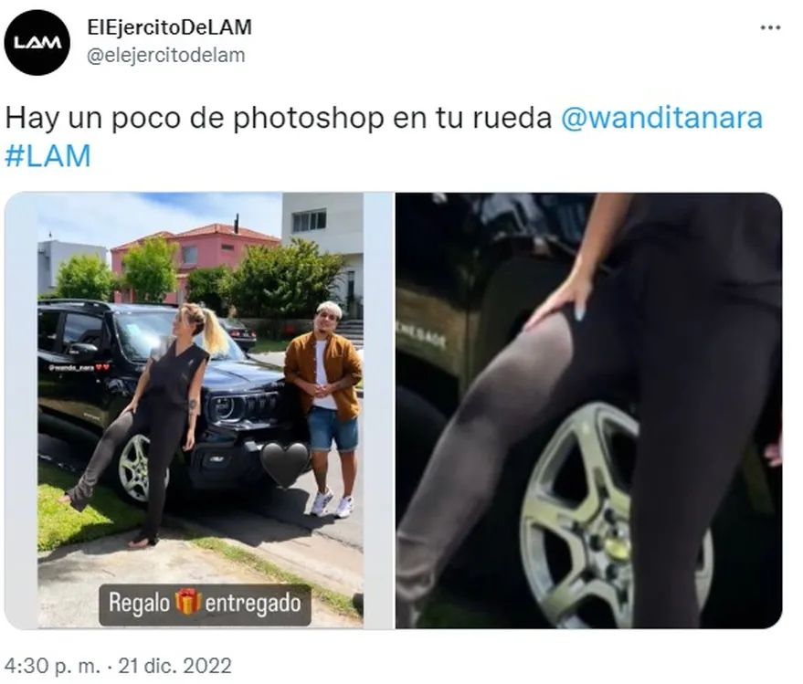 “Hay un poco de Photoshop en tu rueda”, le señalaron algunos internautas a Wanda Nara. En la publicación en cuestión, se puede ver como está distorsionada una de las cubiertas de la camioneta en la que está apoyada la mediática.