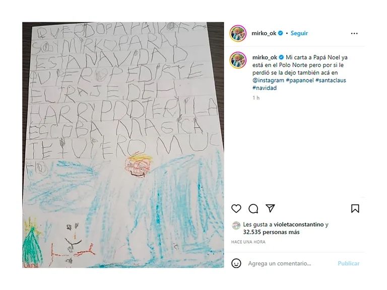 Acompañando la carta en cuestión, en el epígrafe del posteo que subió Marley a la cuenta de Mirko se puede leer: “Mi carta a Papá Noel ya está en el Polo Norte pero por si le perdió se la dejo también acá”.