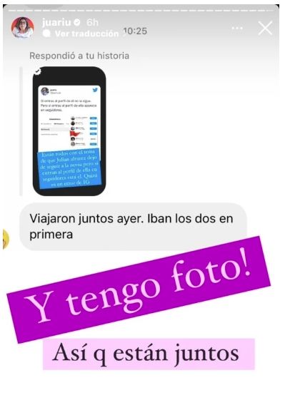 Un informate de Juariu le escribió de manera privada lo que atestiguó directamente, dado que aseguró: “Viajaron juntos ayer, iban en primera”. A lo que la periodista añadió: “Y tengo fotos”. De esta manera se terminaron las especulaciones sobre la crisis.