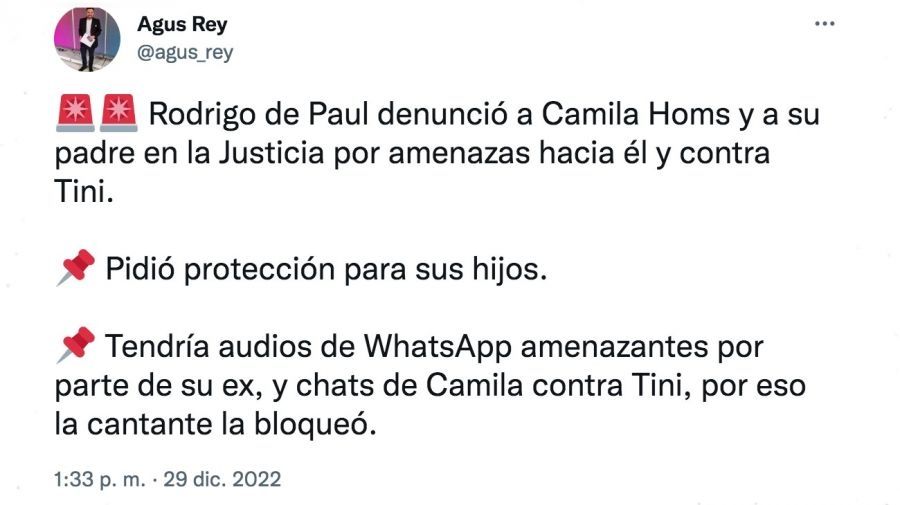 A través de su cuenta de Twitter, el periodista Agus Rey aseguró que Rodrigo de Paul inició acciones legales contra Camila Homs. "Rodrigo de Paul denunció a Camila Homs y a su padre en la Justicia por amenazas hacia él y contra Tini. Pidió protección para sus hijos. Tendría audios de WhatsApp amenazantes por parte de su ex, y chats de Camila contra Tini, por eso la cantante la bloqueó", expresó el comunicador.