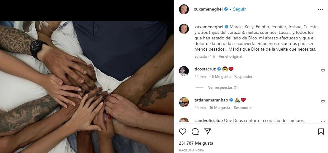 A través de sus redes sociales, Xuxa le dedicó un mensaje a la última esposa de Pelé y a sus seres más cercanos. “Marcia, Kelly, Edinho, Jennifer, Joshua, Celeste y otros hijos del corazón, nietos, sobrinos, Lucia... Y todos los que han estado del lado de Dico, mi abrazo afectuoso”, comenzó la presentadora junto a una imagen de varias manos entrelazadas con las del ídolo del fútbol..