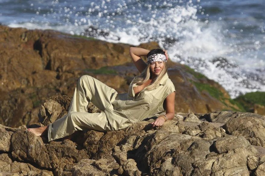 Entre las prendas con las que posó Jelinek, que son furor en esta temporada, se destacan las bikinis tejidas al crochet y los vestidos con estampados batik. En tanto que al lucir un overall sin mangas sobre las rocas, la modelo se animó a posar sin la parte superior de su traje de baño.