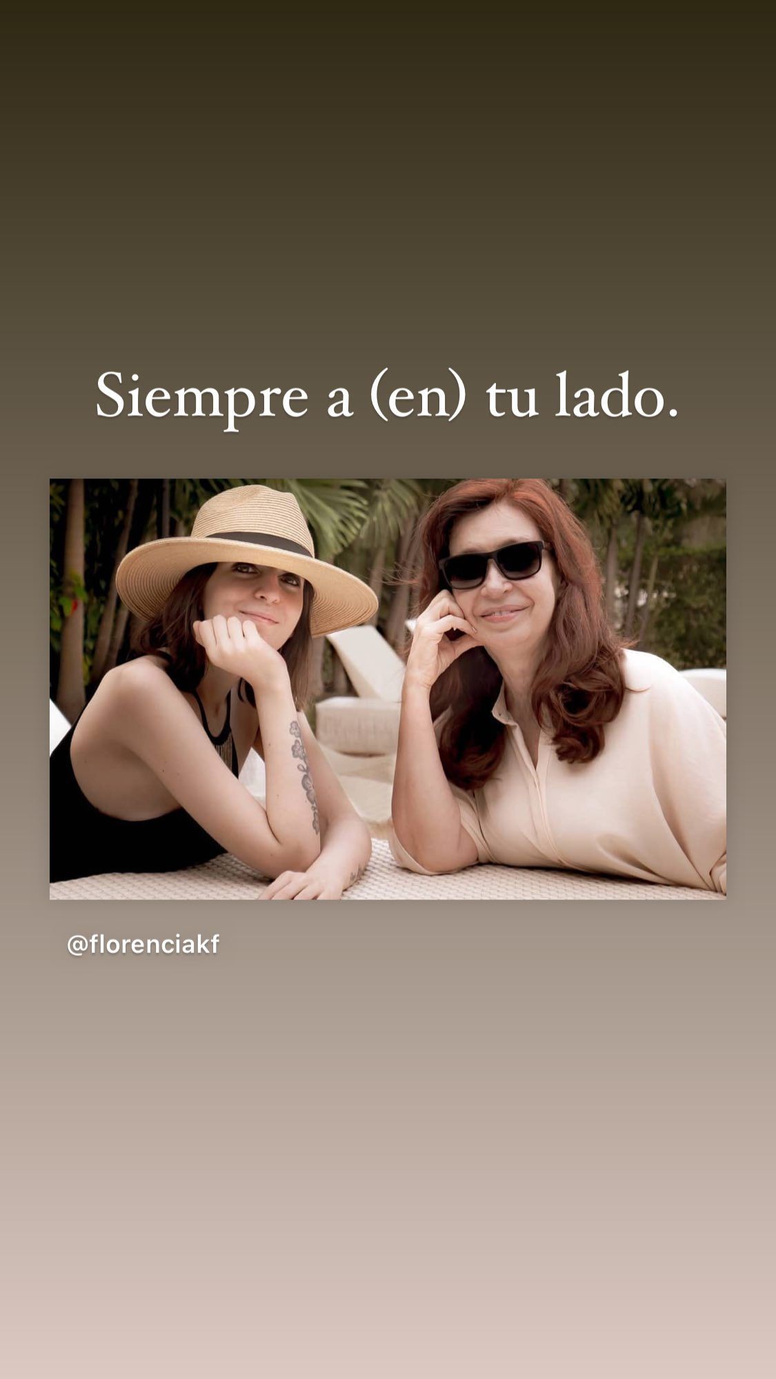 A través de sus historias de Instagram, la directora de cine compartió una foto junto a Cristina Fernández de Kirchner, para expresar su apoyo incondicional. "Siempre a (en) tu lado", escribió Florencia Kirchner.