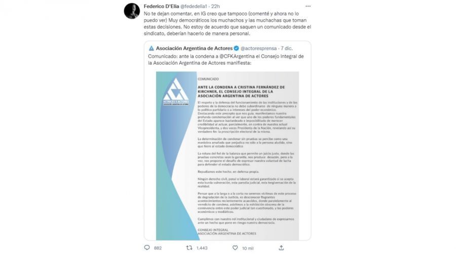 "No te dejan comentar, en Instagram creo que tampoco (comenté y ahora no lo puedo ver). Muy democráticos los muchachos y las muchachas que toman estas decisiones. No estoy de acuerdo que saquen un comunicado desde el sindicato, deberían hacerlo de manera personal", expresó desde su cuenta de Twitter Federico D'Elía.