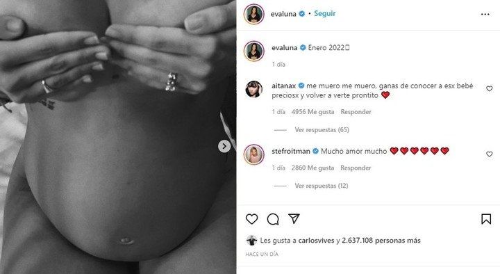 Recordemos que Evaluna fue noticia el fin de semana al compartir una jugada foto en sus redes sociales. La hija de Ricardo Montaner se mostró como Dios la trajo al mundo a semanas de dar a luz a su primer hijo. La cantante compartió con sus 19 millones de seguidores de Instagram una foto al natural en blanco y negro. "Enero 2022", fueron las palabras que eligió para acompañar la imagen.