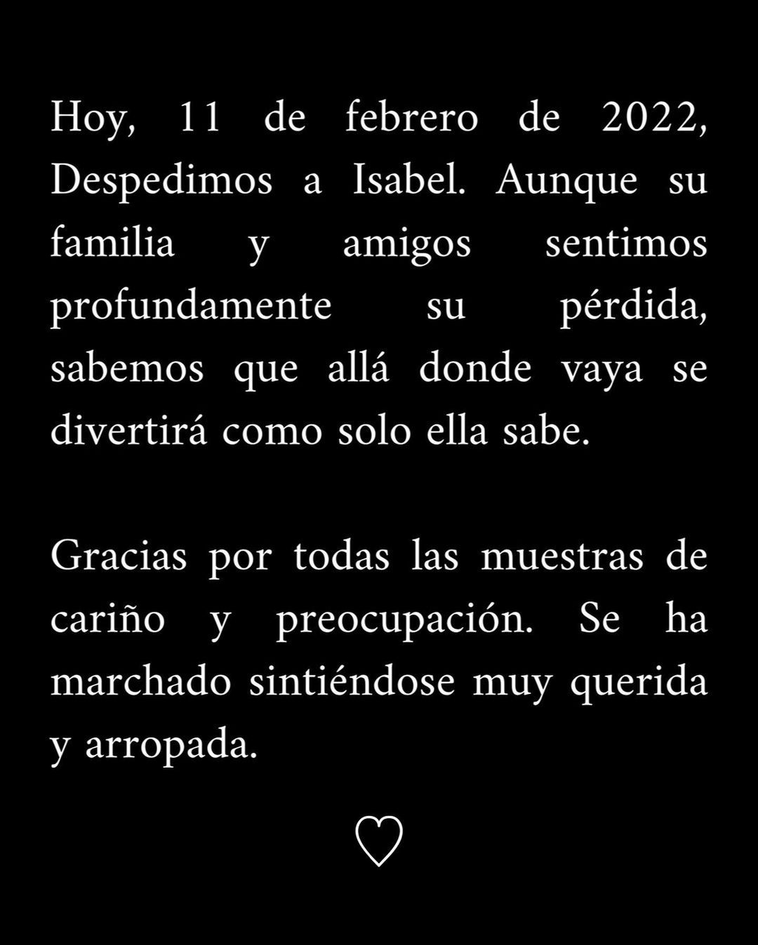 "Hoy, 11 de febrero de 2022, despedimos a Isabel. Aunque su familia y amigos sentimos profundamente su pérdida, sabemos que allá donde vaya se divertirá como solo ella sabe. Gracias por todas las muestras de cariño y preocupación. Se ha marchado sintiéndose muy querida y arropada", dicta el texto.