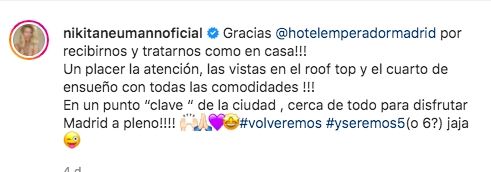 "En un punto ‘clave’ de la ciudad, cerca de todo para disfrutar Madrid a pleno", agregó junto a las imágenes donde se la puede ver disfrutando de las instalaciones del hotel. Luego, añadió una serie de hashtags: "#Volveremos #YSeremos5 (o 6?)", lanzó Nicole.